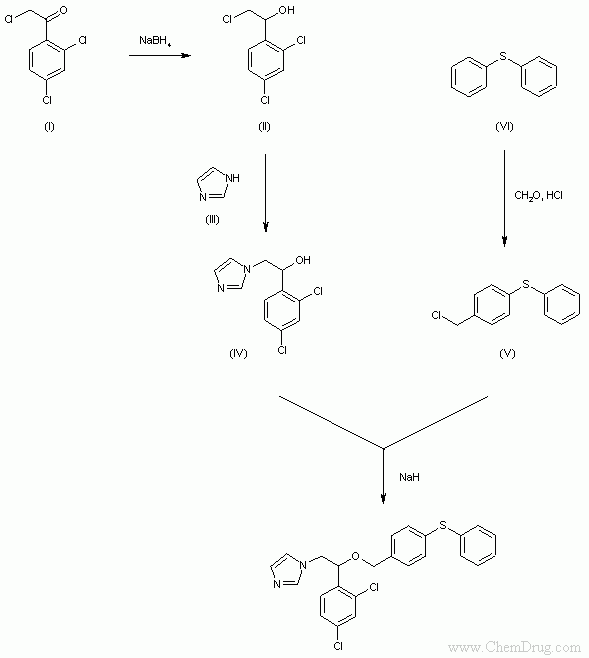 - 〖合成方法〗The reduction of 2,4-dichlorophenacyl chloride with NaBH4 gives 1-(2,4-dichlorophenyl)-2-chloroethanol (II), which is condensed with imidazole (III) to yield 1-(2,4-dichlorophenyl)-2-(N-imidazolyl)ethanol (IV). Finally, this compound is condensed with 4-(phenylthio)benzyl chloride (V) [prepared by chloromethylation of diphenyl sulfide (VI) with formaldehyde and HCl] using NaH as condensing agent.