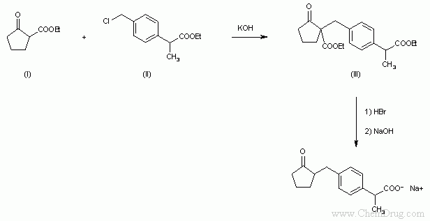 - 〖合成方法〗The reaction of ethyl 2-oxocyclopentanecarboxylate (I) with ethyl 2-(4-chloromethylphenyl)propionate (II) by means of KOH in hot DMF gives ethyl 2-[4-(1-ethoxycarbonyl-2-oxocyclopentan-1-ylmethyl)phenyl]propionate (III), which is then hydrolyzed and decarboxylated by treatment with 47% HBr in refluxing dioxane.