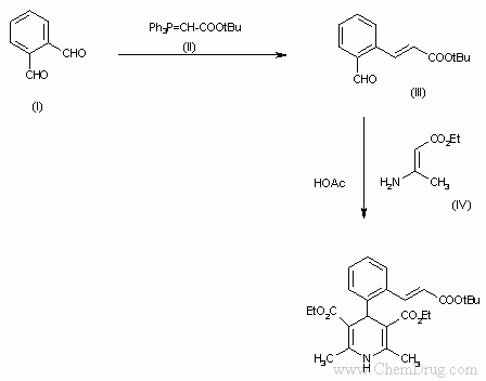 - 〖备注〗The Wittig condensation of o-phthalaldehyde (I) with tert-butyl triphenylphosphoranylideneacetate (II) in methylene chloride gives tert-butyl 3-(2-formylphenyl)-2(E)-propenoate (III), which is then cyclized with ethyl 3-aminocrotonate (IV) in acetic acid (1).