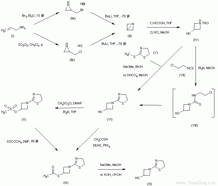 - 〖合成方法〗Halogenation of allylamine (I) with either bromine or sulfuryl chloride produced the corresponding (halomethyl)aziridines (II). Subsequent treatment of (II) with n-butyllithium at -78 C yielded 1-azabicyclobutane (III). Opening of the bicyclic system of (III) with formic acid followed by acid hydrolysis provided 3-hydroxyazetidine (IV). This was condensed with 2-(methylsulfanyl)thiazoline (V) to give thiazolinylazetidine (VI). Alternatively, 3-hydroxyazetidine (IV) was condensed with 2-chloroethyl isothiocyanate (VII) to give the intermediate thiourea (VIII), which cyclized to the thiazoline (VI). Conversion of the hydroxyl group of (VI) into the thioacetate (IX) was carried out by either coupling with thioacetic acid under Mitsunobu conditions or by conversion to mesylate (X) followed by displacement with potassium thioacetate. The required thiol (XI) was then obtained from (IX) by basic hydrolysis of the thioacetate ester.