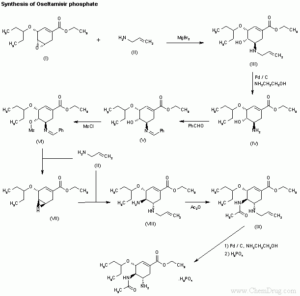 - 〖合成方法〗A new synthesis of oseltamivir phosphate has been described: The opening of the oxirane ring of the already reported oseltamivir intermediate (I) by reaction with allylamine (II) in t-BuOMe/MeCN 9:1 provides the allylamino derivative (III), which is deallylated with Pd/C and ethanolamine to give the primary amine (IV). The direct conversion of the amino alcohol (IV) into the vicinal diamine (VIII) is achieved, without isolation of the intermediates, by reaction of compound (IV) with benzaldehyde to give the benzaldehyde imine (V), mesylation of (V) with MsCl and TEA to the mesylate (VI) and treatment of (VI) with allylamine (II) to yield the aziridine intermediate (VII) that opens to the vicinal diamine (VIII). Acylation of the primary amino group of (VIII) with acetic anhydride in acetic acid provides the acetamide (IX), which is finally deallylated with Pd/C and ethanolamine as before and treated with H3PO4.
