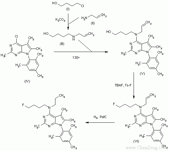 - 〖合成方法〗The reaction of 4-chloro-1-butanol (I) with allylamine (II) by means of K2CO3 in refluxing THF gives N-allyl-N-(4-hydroxybutyl)amine (III), which is condensed with the pyrrolo[2,3-d]pyrimidine derivative (IV) by heating at 130 C in DMSO to afford the tertiary amine (V). The reaction of (V) with TBAF and Ts-F in THF provides the 4-fluorobutyl derivative (VI). Finally, the hydrogenation of the allylic double bond of (VI) with H2 over Pd/C in ethanol gives the target LWH-154.