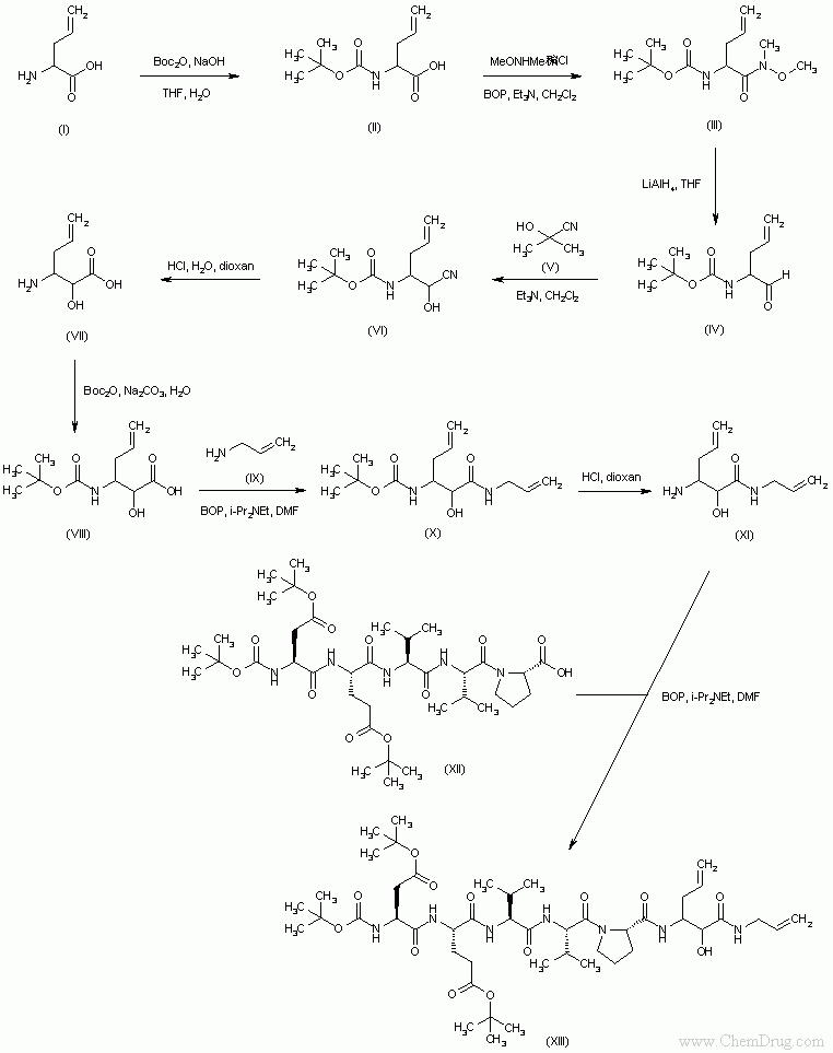 - 〖合成方法〗Racemic allylglycine (I) was protected as the N-Boc derivative (II) and then converted to the Weinreb amide (III) by treatment with N,O-dimethylhydroxylamine and BOP. Reduction of (III) with LiAlH4 afforded aldehyde (IV), which, upon treatment with acetone cyanohydrin (V), furnished the corresponding hydroxy nitrile (VI). Acid hydrolysis of the nitrile (VI) with concomitant Boc group deprotection provided hydroxy acid (VII), which was further reprotected as the N-Boc derivative (VIII). Coupling of hydroxy acid (VIII) with allylamine (IX) yielded amide (X). After Boc group cleavage with HCl in dioxan, the resulting amine (XI) was coupled with pentapeptide (XII) (obtained using a peptide synthesizer under standard conditions), to give the alpha-hydroxyamide (XIII).