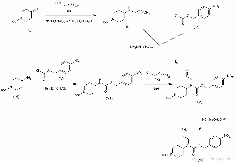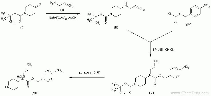 - 〖合成方法〗Reductive amination of N-Boc-4-piperidone (I) with allyl amine (II) in the presence of sodium triacetoxyborohydride gave aminopiperidine (III), which was condensed with 4-nitrobenzyl chloroformate (IV) to afford carbamate (V). The Boc group of (V) was then cleaved by treatment with methanolic HCl to produce intermediate piperidine (VI).