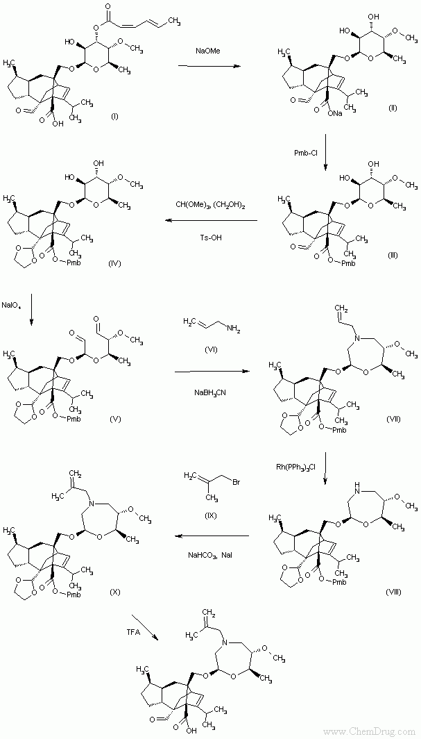 - 〖合成方法〗The hydrolysis of Zofimarin (I) with NaOMe in methanol gives the sodium salt of the deacylated compound (II), which is treated with Pmb-Cl in DMF to yield the p-methoxybenzyl ester (III). The protection of the formyl group of (III) by means of ethyleneglycol, trimethyl orthoformate and TsOH affords the ethylene ketal (IV), which is oxidized at the vicinal diol group by means of NaIO4 in methanol/water to provide the dialdehyde (V). The reductocyclization of (V) with allylamine (VI) by means of NaBH3CN and AcOH in acetonitrile leads to the perhydro oxazepine derivative (VII), which is deallylated by means of Rh(PPh3)3Cl in aqueous ethanol to give compound (VIII). The alkylation of (VIII) with 2-methylallyl bromide (IX) by means of NaHCO3 and NaI in ethanol yields the protected precursor (X), which is finally treated with TFA in dichloromethane to provide the target zofimarin derivative.