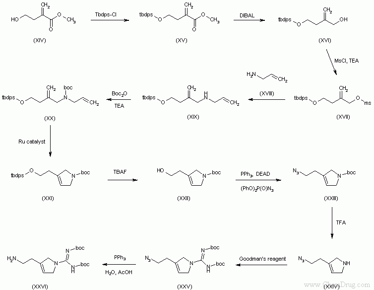 - 〖合成方法〗Synthesis of the 3-pyrroline intermediate (XXVI): The reaction of 4-hydroxy-2-methylenebutyric acid methyl ester (XIV) with Tbdps-Cl and imidazole in DMF gives the silyl ether (XV), which is reduced with DIBAL in dichloromethane to yield the butanol derivative (XVI). The reaction of (XVI) with MsCl and TEA affords the corresponding mesylate (XVII), which is condensed with allylamine (XVIII) to provide the secondary amine (XIX). The protection of the NH group of (XIX) by reaction with Boc2O and TEA gives the carbamate (XX), which is submitted to a ring closing metathesis reaction using a Grubbs Ru catalyst to yield the 3-pyrroline derivative (XXI). The cleavage of the silyl ether group of (XXI) by means of TBAF in THF affords the pyrroline ethanol derivative (XXII), which is treated with PPh3, DEAD and (PhO)2P(O)N3 in THF to provide the azido derivative (XXIII). The deprotection of the NH group of (XXIII) by means of TFA in dichloromethane gives the 3-(2-azidoethyl)-3-pyrroline (XXIV), which is treated with Goodman's reagent to yield the protected amidino derivative (XXV). Finally, the azido group of (XXV) is reduced by means of PPh3, water and AcOH to afford the desired 3-pyrroline-1-carboxamidine (XXVI).