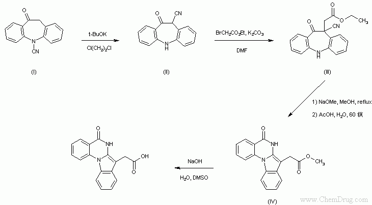 - 〖合成方法〗The dibenzoazepine-5-carbonitrile (I) is converted to its 11-cyano isomer (II) in the presence of potassium tert-butoxide in dichloroethane. Alkylation of the keto nitrile (II) with ethyl bromoacetate leads to the dibenzoazepine derivative (III). Rearrangement of (III) under basic conditions affords the indoloquinazoline (IV). Finally, alkaline hydrolysis of methyl ester (IV) provides the corresponding carboxylic acid.