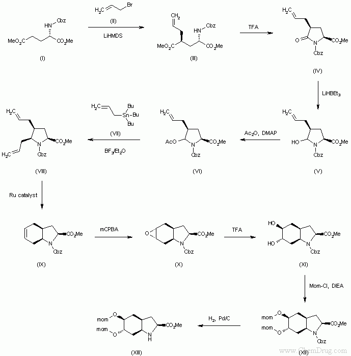 - 〖合成方法〗Synthesis of the perhydroindole intermediate (XIII): The alkylation of the N-protected glutamate (I) with allyl bromide (II) by means of LiHMDS in THF gives the protected chiral allyl glutamate (III) (1), which is cyclized by means of TFA in dichloromethane to yield the pyroglutamate (IV). The reduction of (IV) with LiHBEt3 in THF affords the hydroxy compound (V), which is treated with Ac2O and DMAP in dichloromethane to provide the expected hemiaminal derivative (VI). The reaction of (VI) with allyl tributylstannane (VII) by means of BF3/Et2O in toluene gives the diallyl pyrrolidine (VIII), which is submitted to a ring closure by olefin metathesis using a Grubbs Ru catalyst in dichloromethane to yield the hexahydroindole derivative (IX). The reaction of (IX) with mCPBA in dichloromethane affords the epoxide (X), which is hydrolyzed with TFA to yield the dihydroxy compound (XI). The reaction of (XI) with Mom-Cl and DIEA in dichloromethane provides the bis mom ether (XII), which is treated with H2 over Pd/C in methanol to yield the desired perhydroindole intermediate (XIII) (2).