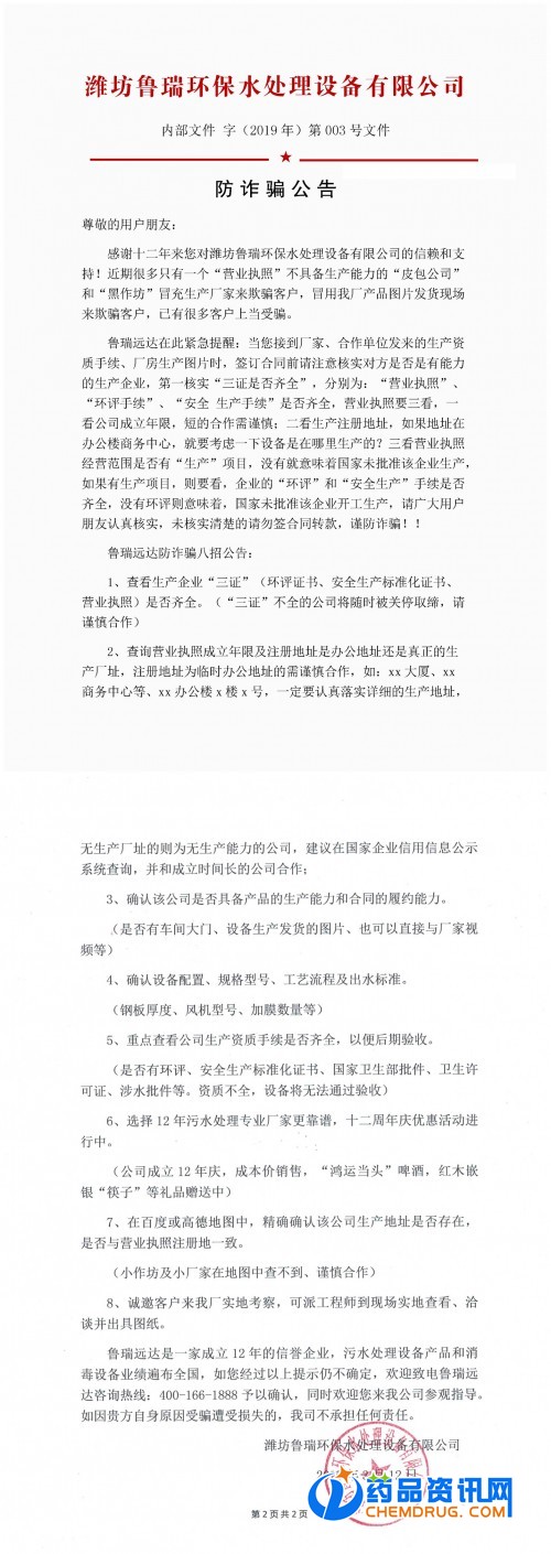 潍坊鲁瑞环保水处理设备有限公司是《全国水利系统产品(http://www.chemdrug.com/invest/)招标重点推荐目录》入选企业(http://www.chemdrug.com/company/),被质量管理认证中心认定为《3·15消费者信得过单位》,我公司成立于2007年,注册资金1688.88万元,公司成立12年来致力于二氧化氯发生器、地埋式一体化污水处理设备、气浮机、板框压滤机、加药装置等各种环保产品的研制、开发、生产和销售。